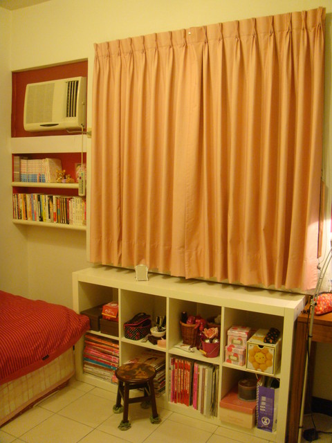 後面書架是做在牆壁上的,但是掉漆很嚴重我用粉彩紙把它貼起來,創造色調一致性
