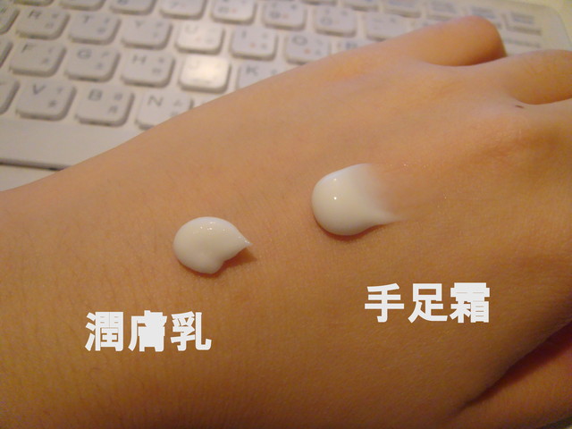 推開之後潤膚乳很快就被吸收,手足霜卻只是被推開