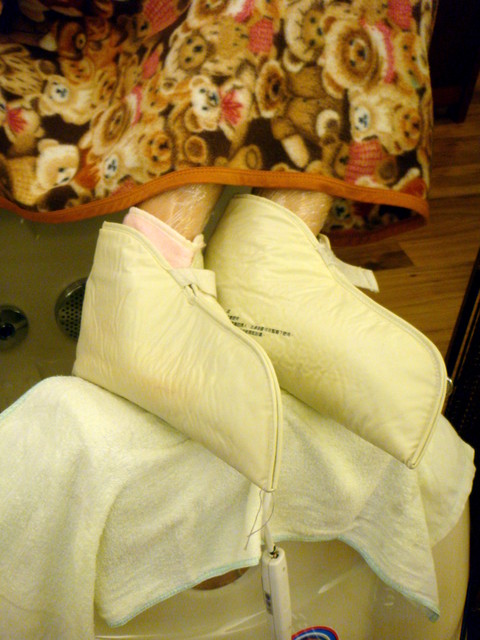 穿上熱腳套。